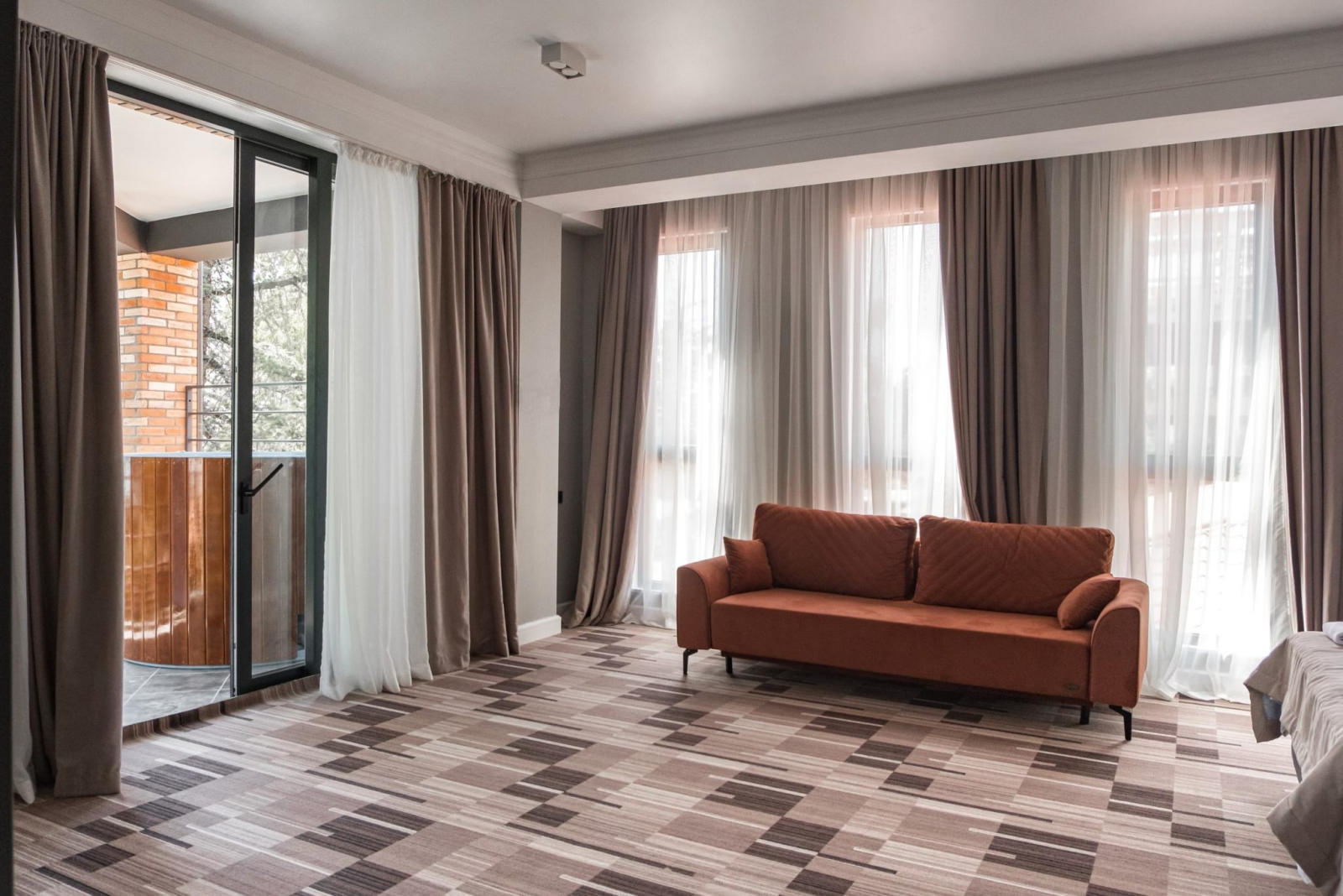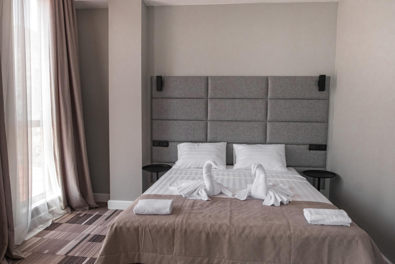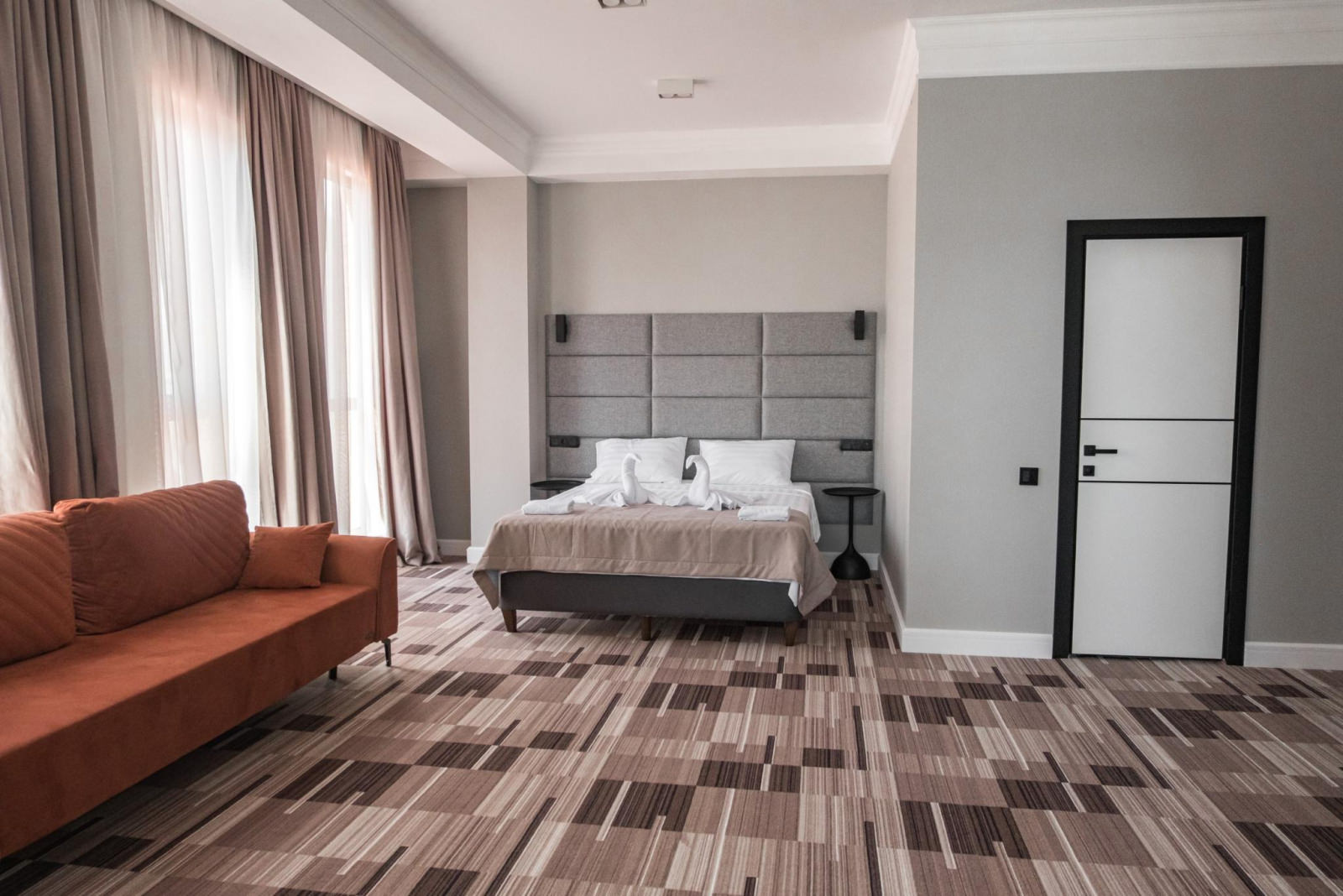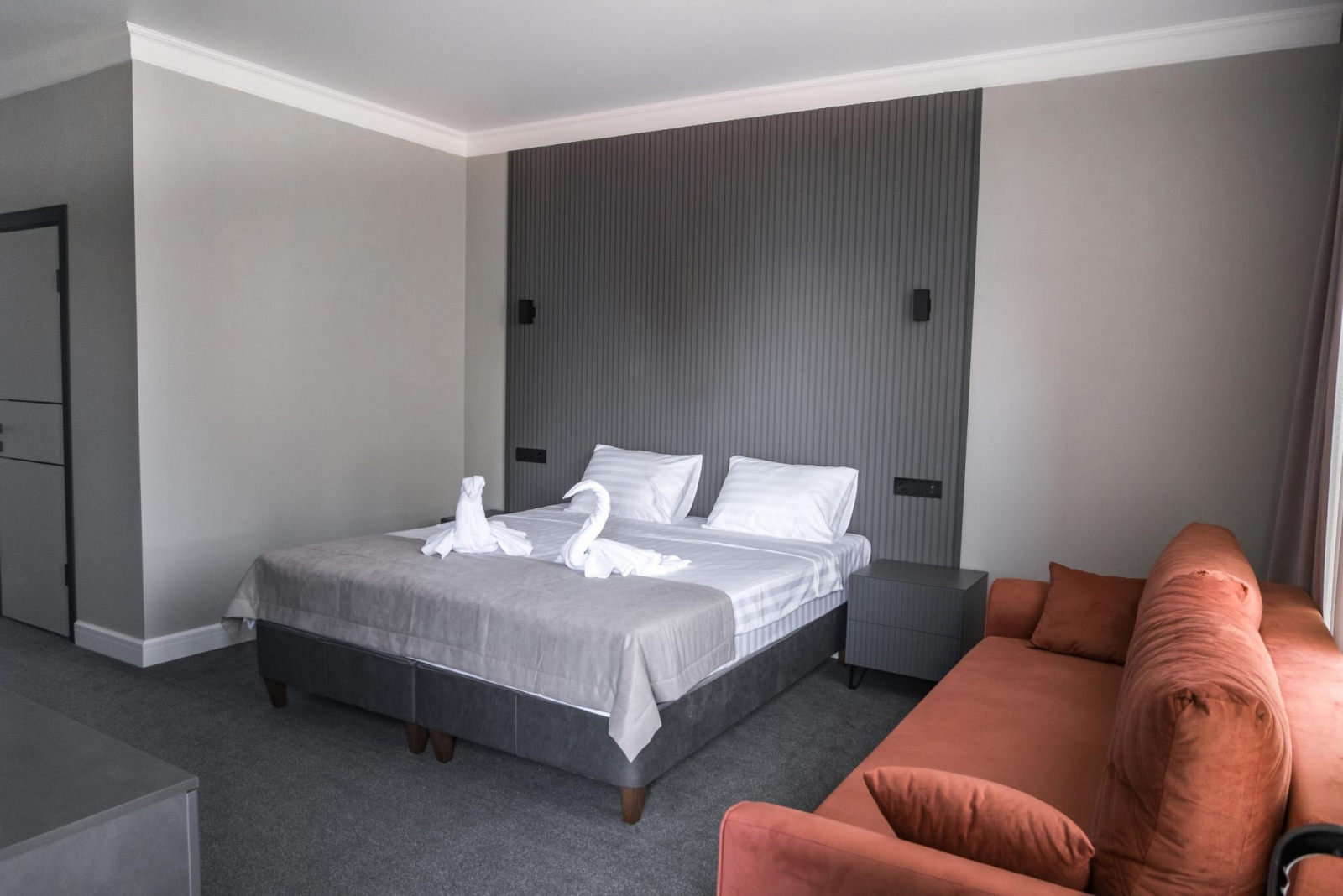 Номер категории Люкс оборудован всем необходимым для комфортного проживания: двуспальная кровать, большой раскладной диван, прикроватные тумбы, комод, вместительный шкаф, тв, ванная комната, косметические наборы для каждого гостя, комплект полотенец, wi-fi. Имеется открытый балкон, с которого открываются виды на парк с озером, горы/море.