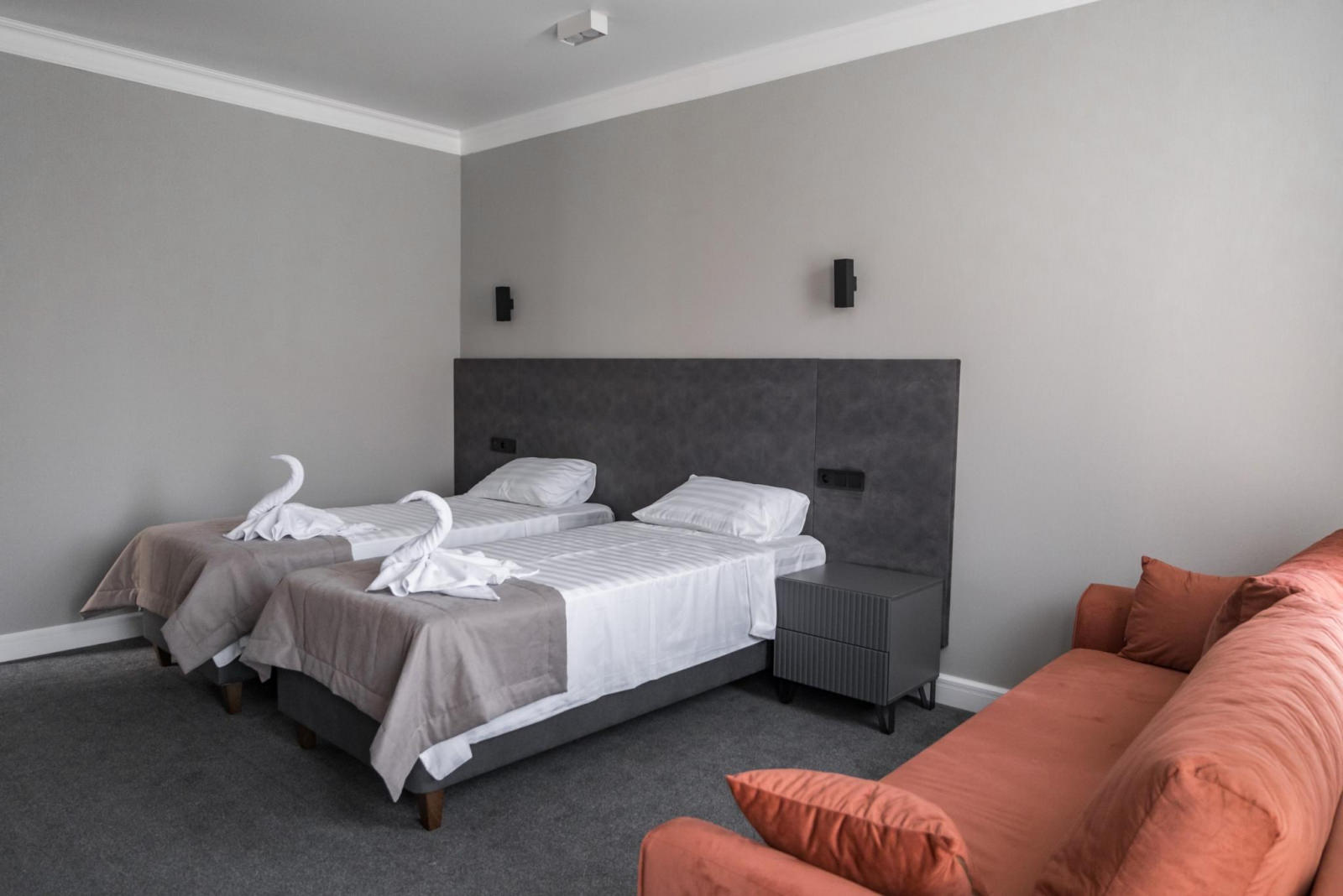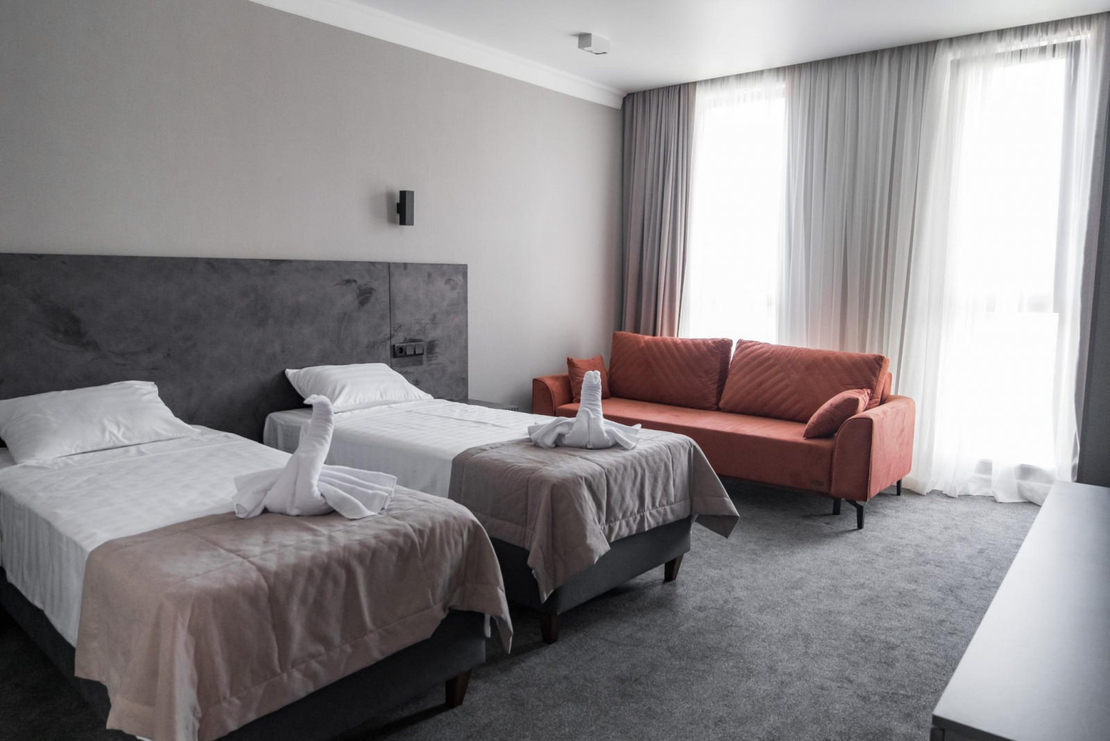 Номер категории Люкс оборудован всем необходимым для комфортного проживания: двуспальная кровать/ две односпальные кровати, большой раскладной диван, прикроватные тумбы, комод, вместительный шкаф, тв, ванная комната, косметические наборы для каждого гостя, комплект полотенец, wi-fi, а с балкона открываются виды на парк с озером, горы/море.